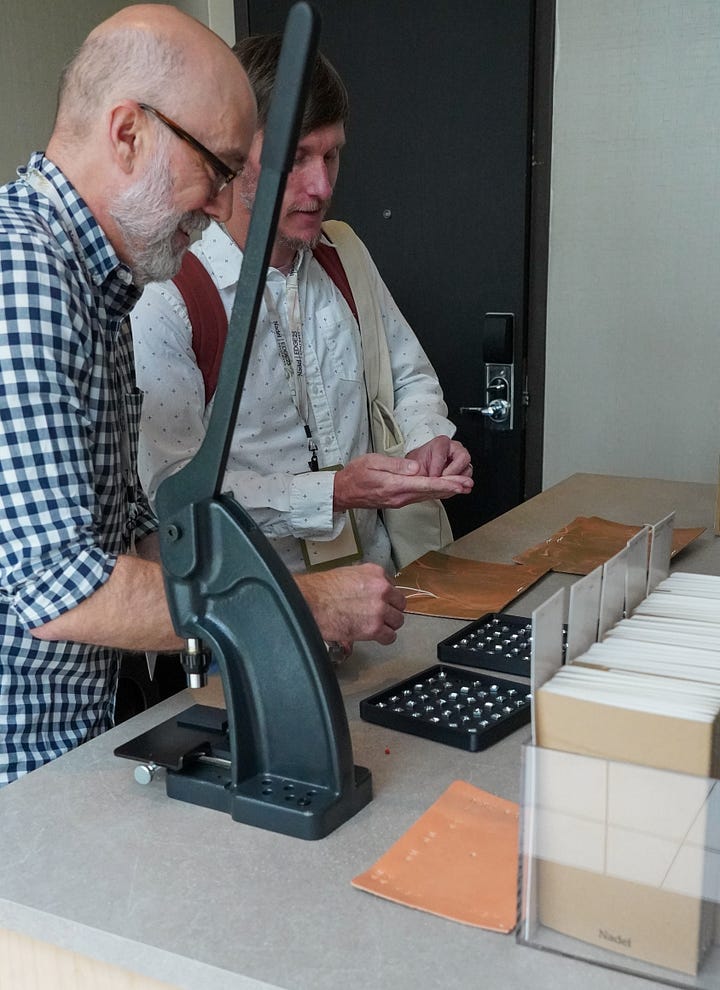 Guests walk up, pick their guts like dotted, lined, planner (be sure to check out our newest stock gut options coming soon!), stamp their initials or message into the leather cover using the press, and walk away with a custom notebook they created themselves. It’s fast, fun, and leaves a lasting impression.