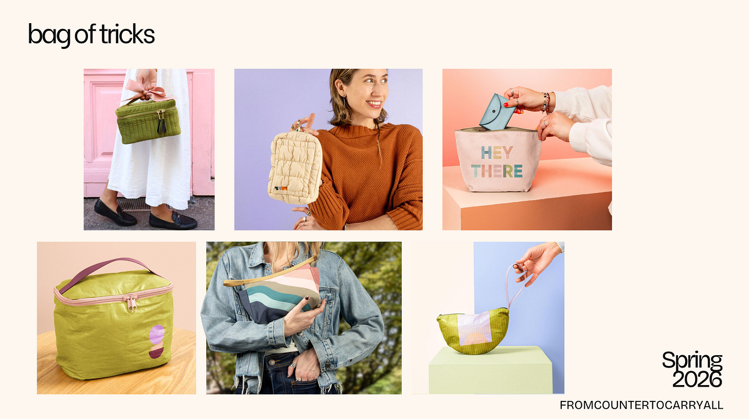This is the gateway drug to color trends. No full-bleed commitment required. Think trims, handles, zipper tape, small accessories, all little hits that do the work without overwhelming the whole piece. As SP put it: a little goes a long way.