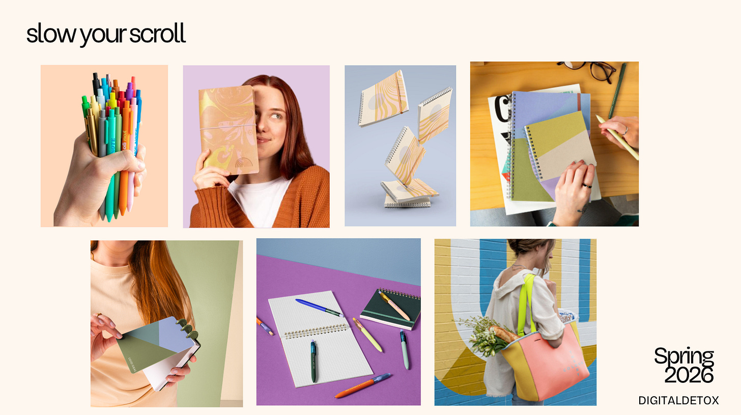 This trend is all about tactile, nostalgic, intentional things: notebooks, journals, fun pens, art supplies, real books (yes, those still exist). SP introduced the idea of the analog tote, a screen-free carry-all filled with whatever keeps your hands busy and your phone out of reach.